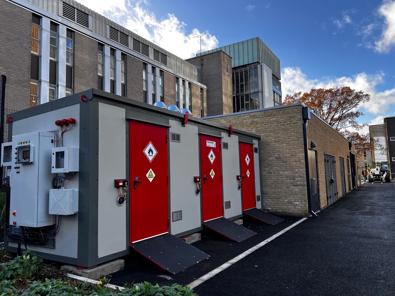 The fully bunded, pre-fabricated unit features a 1,000-litre containment capacity, safeguarding the environment while complying with strict ATEX-rated safety regulations. Equipped with advanced ventilation, fire detection, and gas/vapour alarms, the unit integrates seamlessly with the University’s Building Management System (BMS) and fire alarm network.